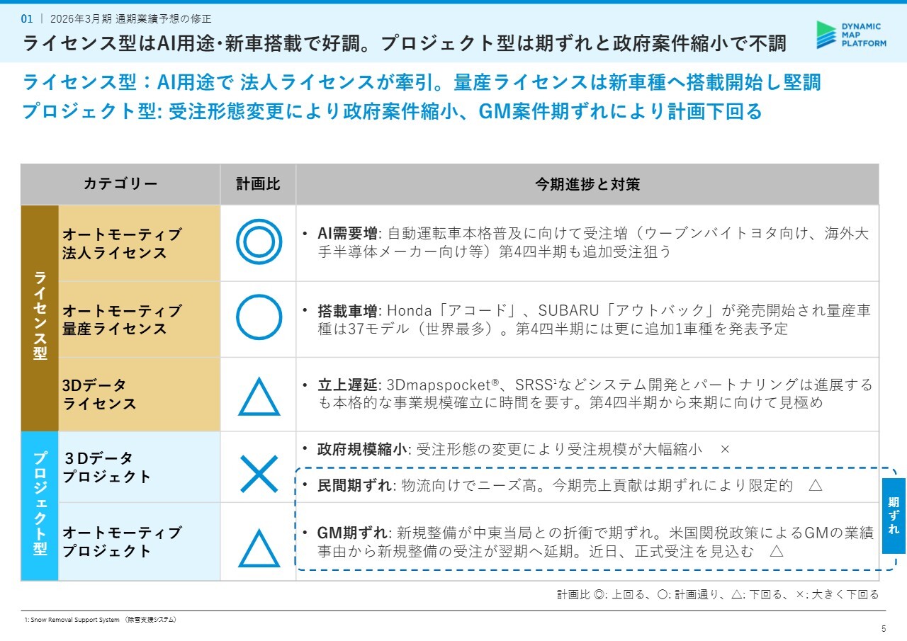 ライセンス型はAI用途・新車搭載で好調。プロジェクト型は期ずれと政府案件縮小で不調