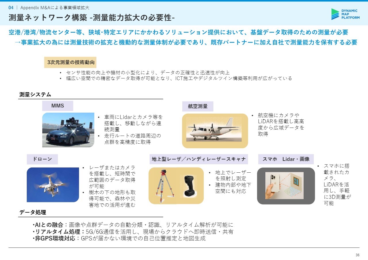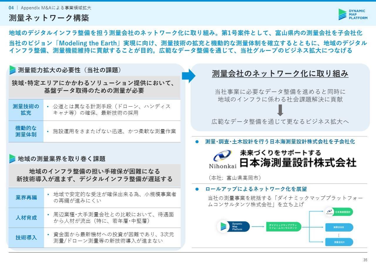 また、新たな国や地域への進出および事業展開、国内ではM&Aロールアップによる測量会社のネットワーク化を通じた地方展開の加速を目指します。