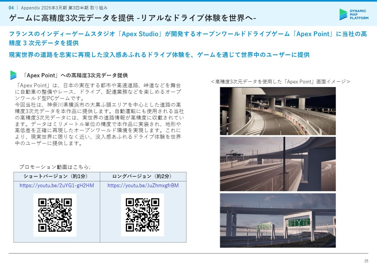 具体的にはスライドに投影していますが、フランスのApex Studioが開発しているオープンワールド型のドライブゲームで『Apex Point』というゲームがあります。ここに、当社の横浜市大黒ふ頭エリアにおける高精度3次元地図データを提供しました。