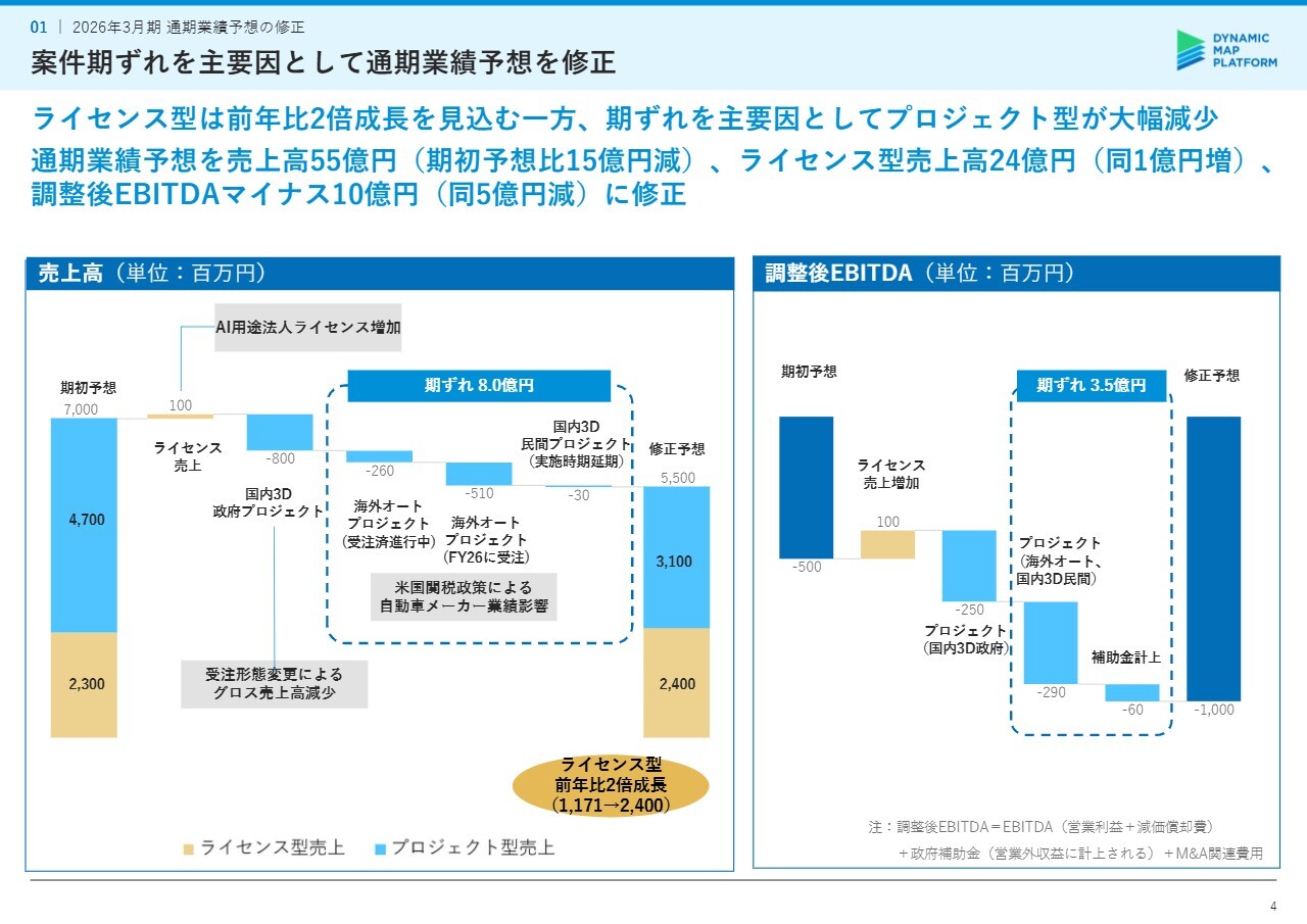 ライセンス型で上振れた売上高1億円が、そのまま調整後EBITDAにプラスに働いていますが、利益面ではプロジェクト型の案件で減少しています。具体的には、プロジェクト案件の期ずれによる影響が合計2億9,000万円、補助金6,000万円が翌期へ期ずれする見込みです。