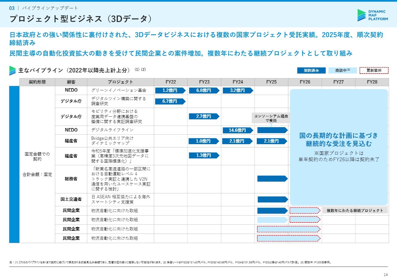 3つ目は、プロジェクト型の3Dデータビジネスのカテゴリーです。国家プロジェクト案件や契約済みの各案件について、第3四半期に研究・開発に取り組みました。今期の売上は、昨年度14億6,000万円を計上した「デジタルライフライン」というプロジェクトが、受注形態の変更に伴い大幅に規模が縮小したことにより、減少しました。