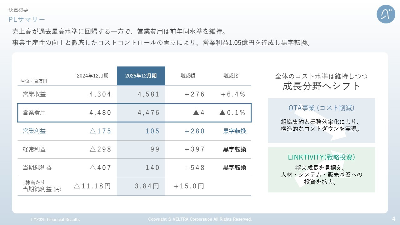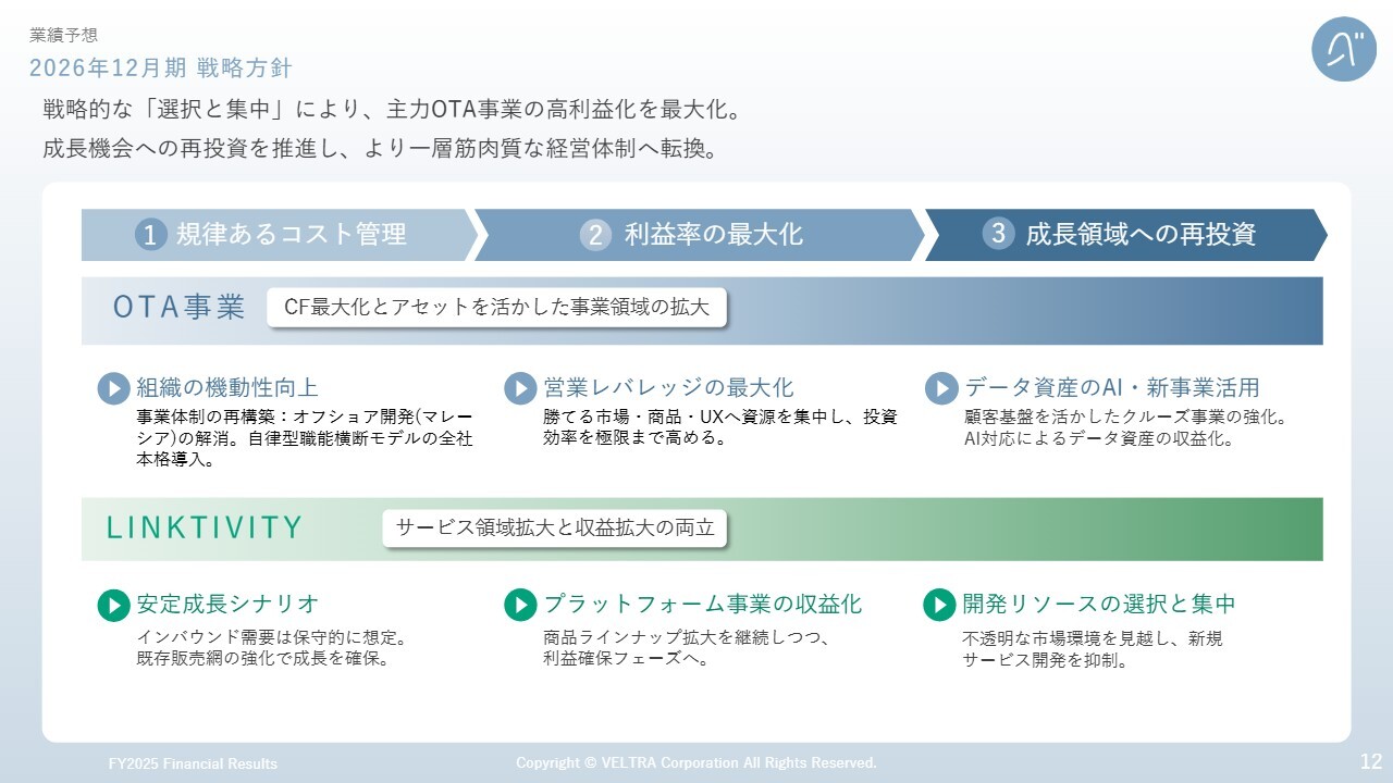 その内容は、一律のコスト削減だけではありません。OTA事業では、徹底した組織集約と効率化により構造的なコストダウンを実現する一方で、「LINKTIVITY」では将来の成長を見据え、人材やシステムへの投資を戦略的に拡大しました。攻めと守りの資源配分を明確に変えたことが、今回の黒字転換の源泉となっています。