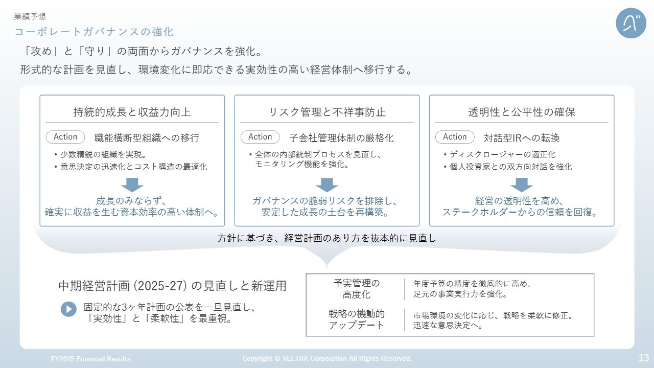 攻めのガバナンスとして組織をスリム化し、意思決定を早める一方で、守りのガバナンスとして内部統制を徹底し、脆弱性を完全に排除します。透明性の高い対話型IRを通じて、みなさまからの信頼を早期に回復し、持続的な企業価値向上に全力で取り組んでいきます。