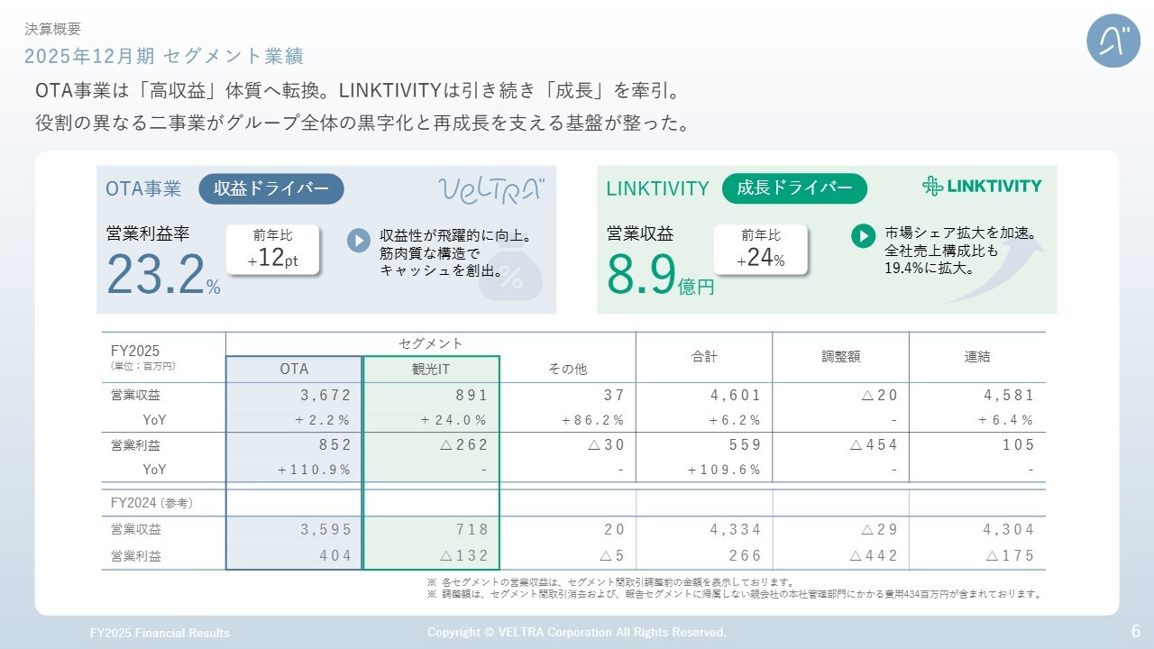 セグメントの業績です。当社は現在、キャッシュを創出するOTA事業と、市場を拡大する「LINKTIVITY」という明確な役割分担によるデュアルエンジン体制を確立しています。