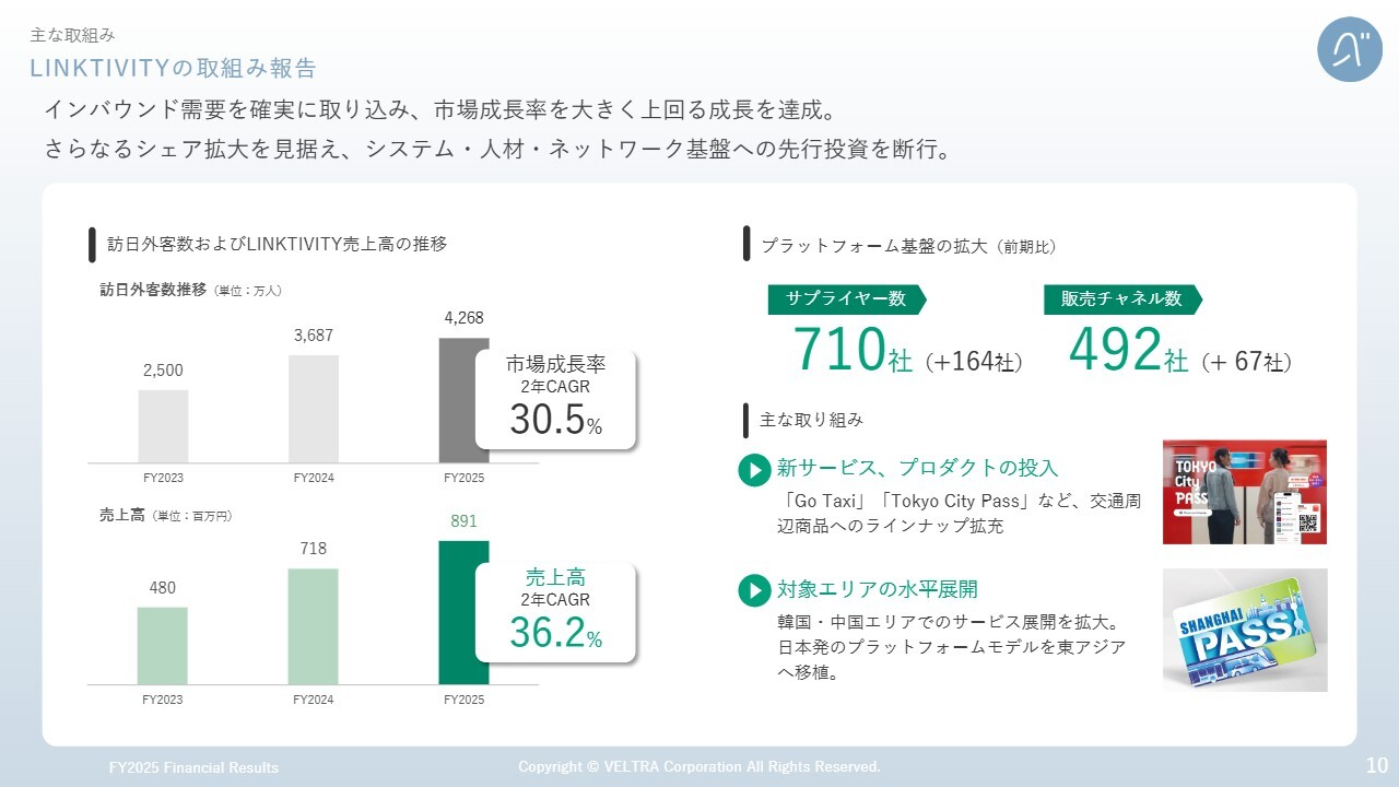 「LINKTIVITY」の取組みの報告です。成長の要である「LINKTIVITY」は、インバウンド市場の伸びを上回る24パーセントの増収を達成しました。単なるチケット販売にとどまらず、「Go Taxi」「Tokyo City Pass」など交通インフラとの連携を進め、さらに東アジアへの水平展開を加速させています。
