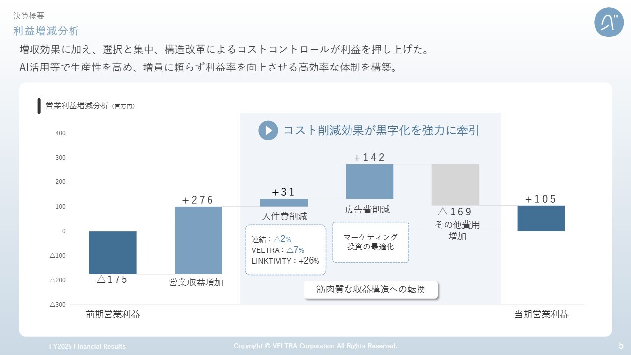 次に、利益増減分析です。利益が改善した要因を図で示しています。増収によるプラス効果に加え、人件費や広告費などの固定費・準固定費の最適化が黒字化を強力に牽引しました。