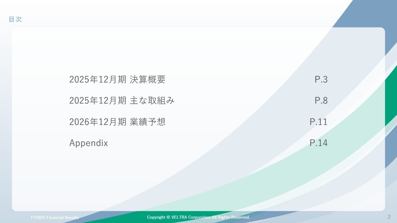 二木渉氏:ベルトラ株式会社代表取締役社長兼CEOの二木です。本日は決算説明会にご参加いただき、誠にありがとうございます。2025年12月期の決算について、決算概要を含めた3点をご説明します。