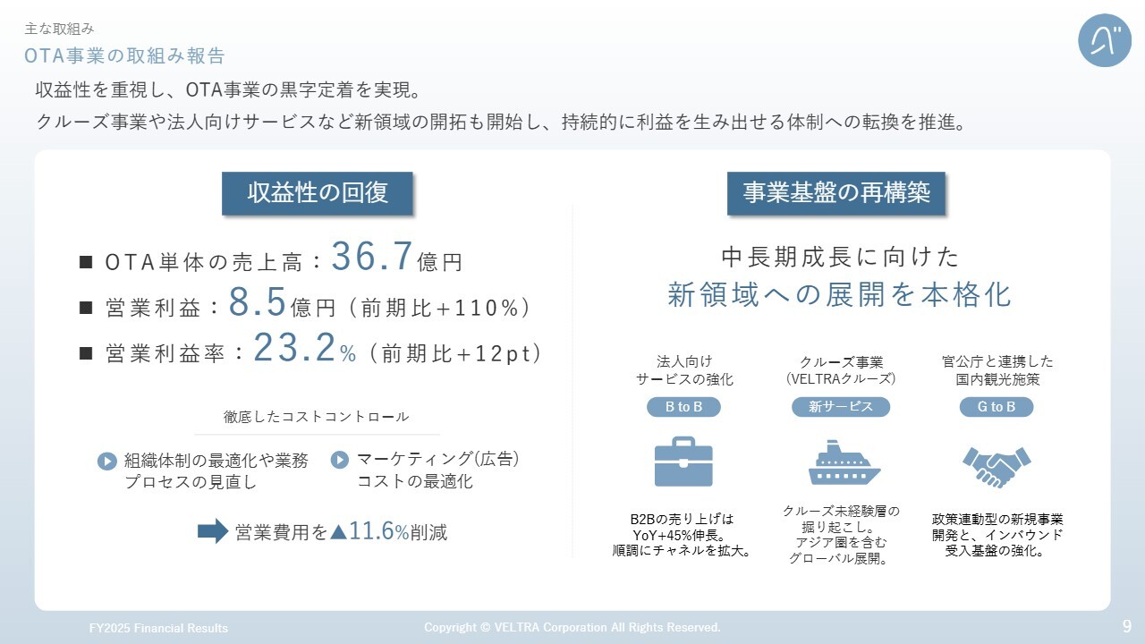ここからは、それぞれの事業について具体的にどのような施策を行ったのかご報告します。OTA事業では、収益性の定着にこだわりました。マーケティングコストと組織体制の最適化や、業務プロセスの見直しを実行し、営業費用を11.6パーセント削減しました。これにより、安定して利益を生み出す構造を作りました。