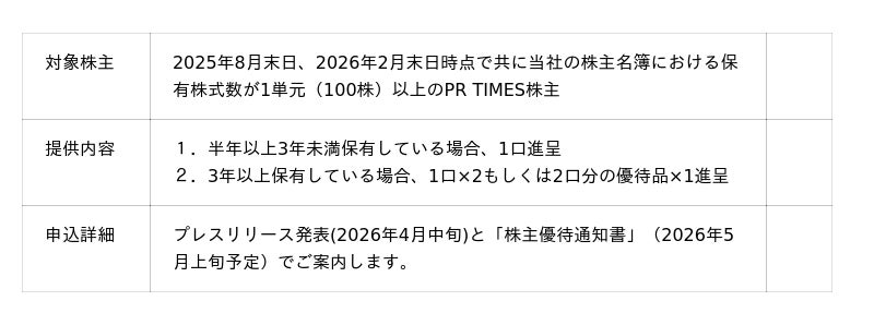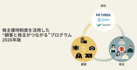 プレスリリース配信サービス「PR TIMES」等を運営する株式会社PR TIMES(東京都港区、代表取締役:山口拓己、東証プライム・名証プレミア:3922)は、2026年2月20日(金)より、株主優待制度を活用した“顧客と株主がつながる”プログラム2026年版の企業エントリーの受付を開始しました。本プログラムは、当社サービス(PR TIMES、Jooto、Tayori)をご利用する企業の商品・サービスを、株主優待制度を活用して当社株主に進呈する取り組みです。本プログラムに参画した企業の商品・サービスから、当社株主が選択したものを当社が購入し、株主へ進呈します(詳細後述)。
