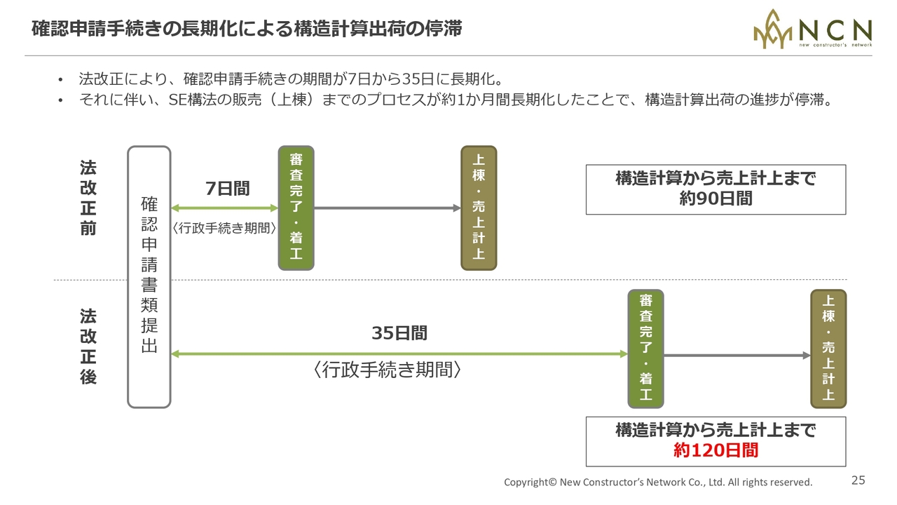 田鎖:後ほど詳しくご説明しますが、昨年4月に建築基準法が改正されました。それに伴い確認申請、つまり建物を建てる前の工程が法律により1ヶ月以上延びました。