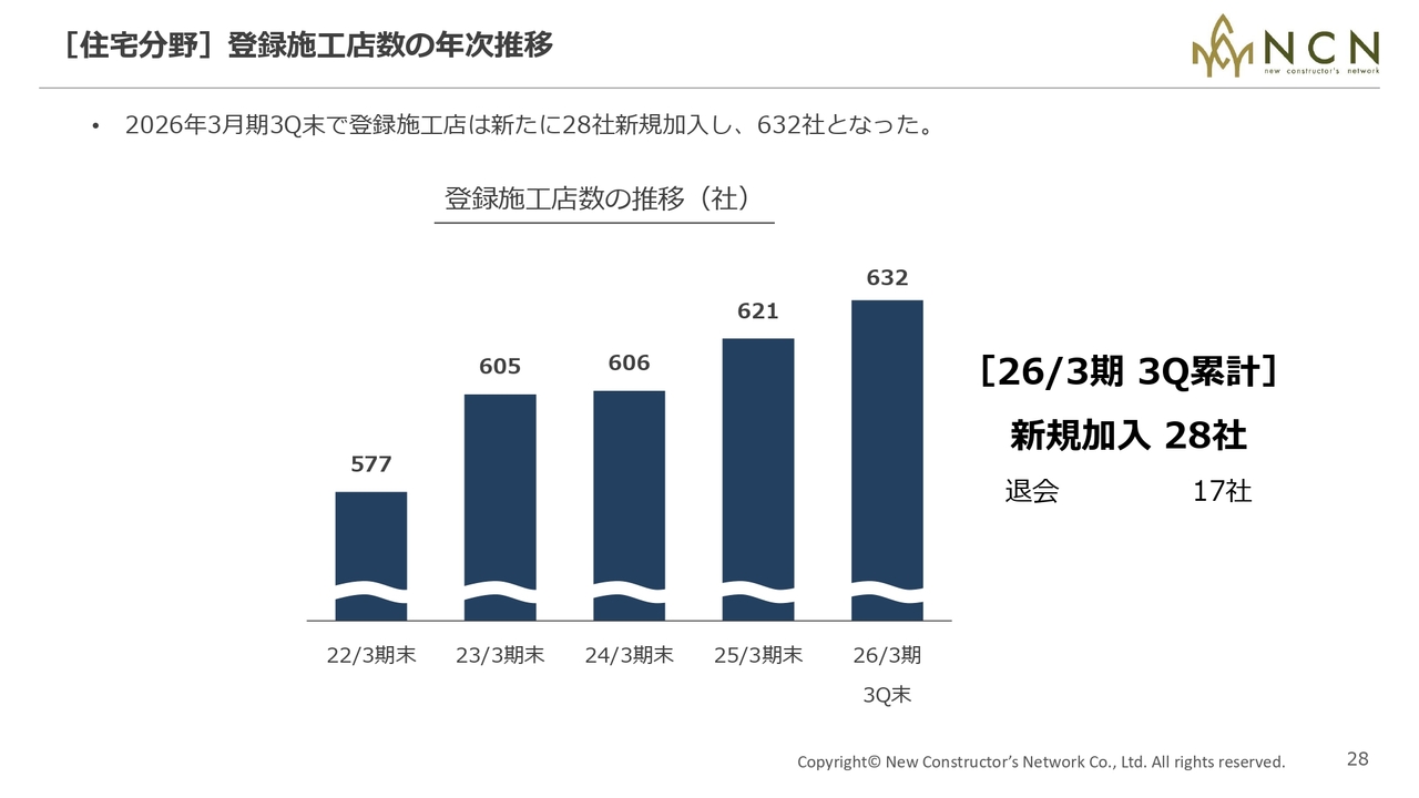 田鎖:住宅分野については、スライドのとおり、我々の仲間である登録施工店が順調に増加しています。一方、今回は退会が17社ありましたが、トータルでは増加となっています。