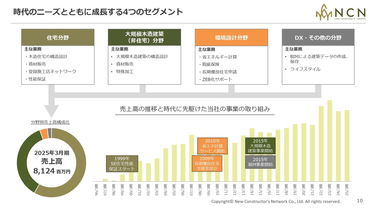 田鎖:当社は設立から約29年が経過しましたが、時代の変化に伴い、住宅分野、大規模木造建築(非住宅)分野、環境設計分野、そしてDX・その他の分野へと徐々に業容を広げ、業績を伸ばしています。