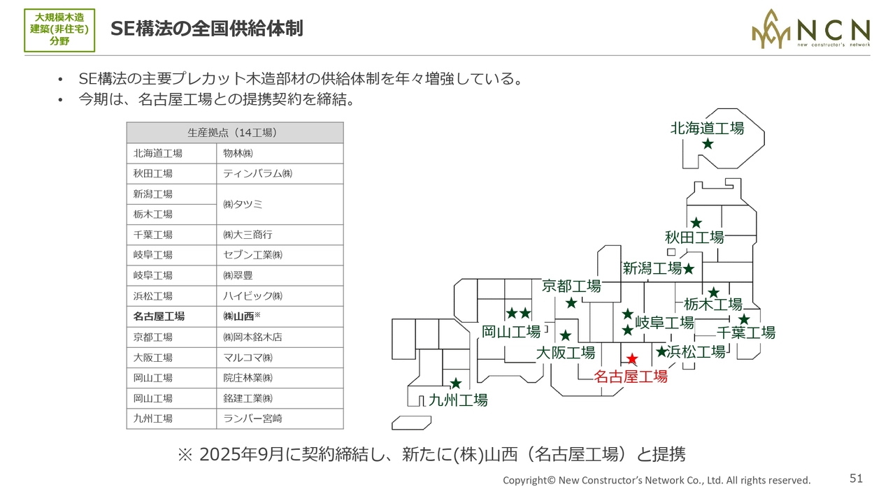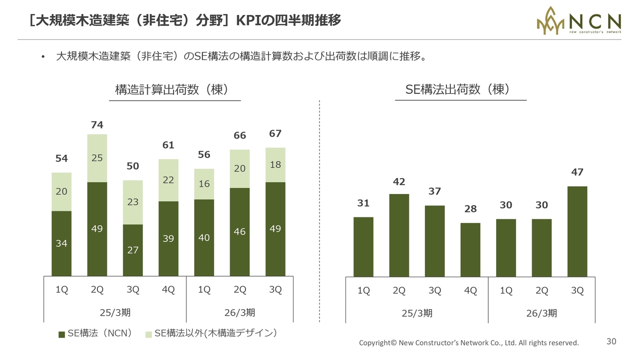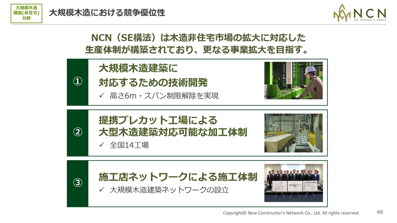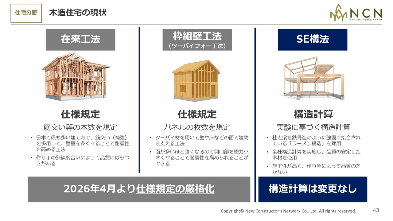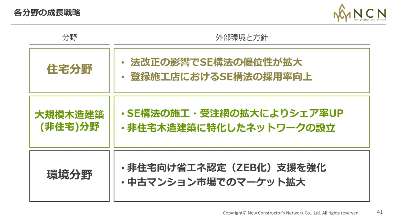 一方、住宅分野においては「SE構法」の採用率が最も重要で、解決すべき課題となっています。これに対しては、価格設定やサービス内容をさらに充実させる必要があります。また、少しでもリーズナブルな価格で提供できる体制を構築したいと考えています。