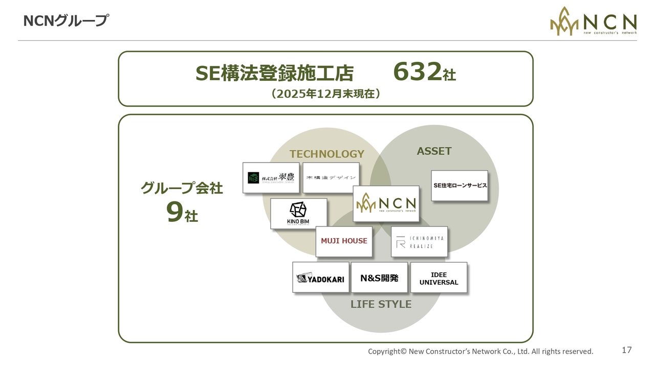 最後に、アセット分野としては、住宅ローンを提供するSE住宅ローンサービスがあります。NCNグループは、これら9社のグループ会社によって構成されています。