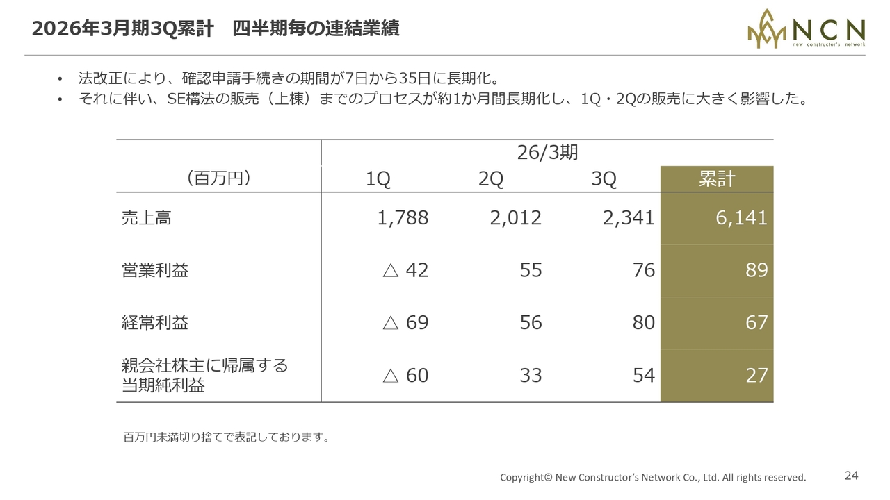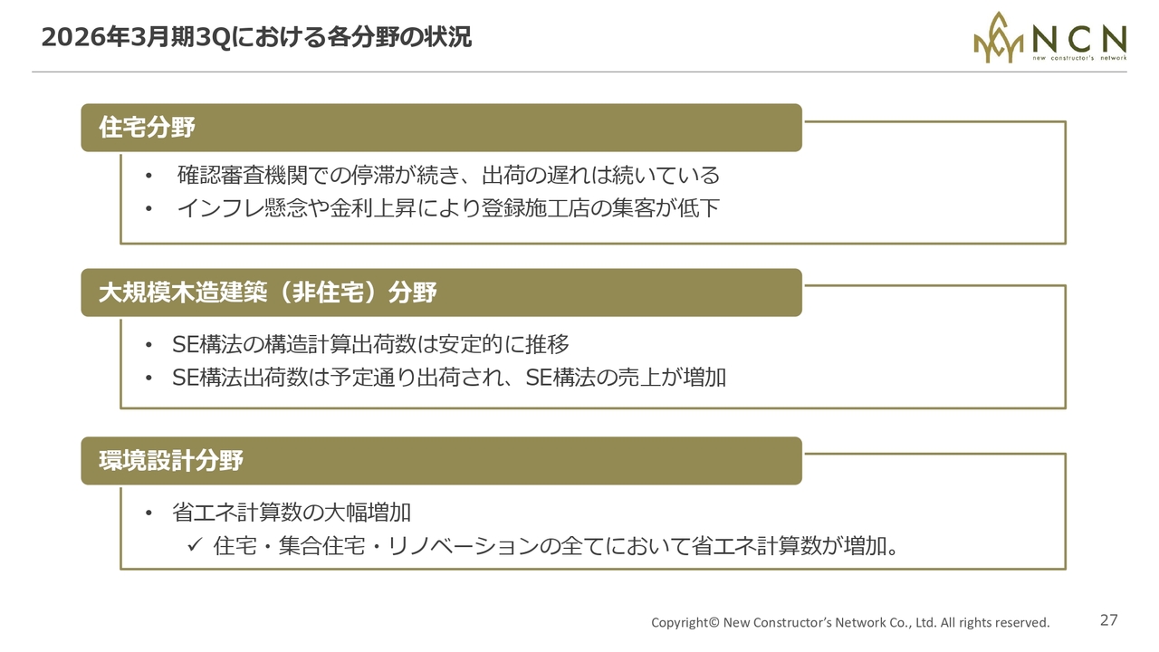 しかしながら、第3四半期における集客の減少や確認申請の長期化の影響を受け、年間ではおおむね昨年並みか、若干プラス程度で終わる見込みとなっています。これが第3四半期までの振り返りと反省点です。