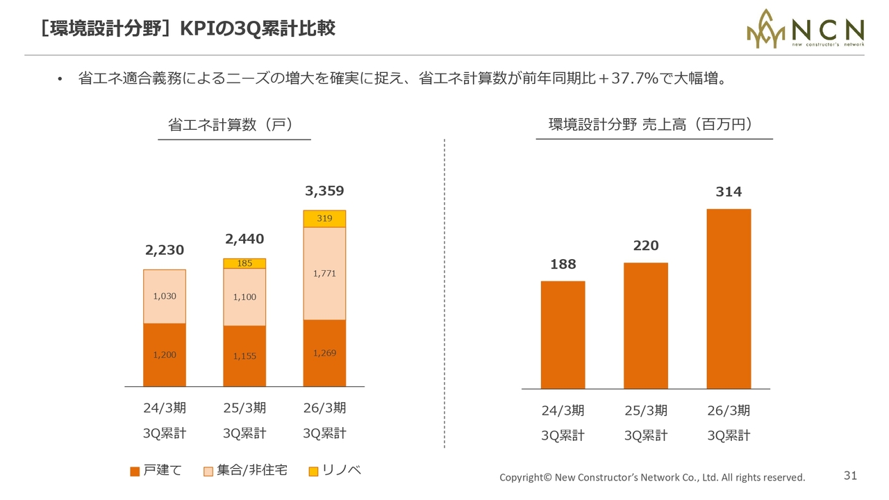 田鎖:環境設計分野のKPIです。スライド左側のグラフは、省エネルギー計算の実施数を示しています。住宅分野や、非住宅と呼ばれる集合住宅や大型建物の分野、そして今期から開始したマンションのリノベーションについても数字を伸ばしています。