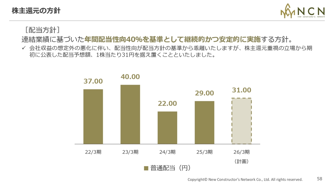 田鎖:最後に、株主還元方針についてご説明します。当社は連結業績に基づき、年間配当性向40パーセントを基準として継続的に配当を行っています。