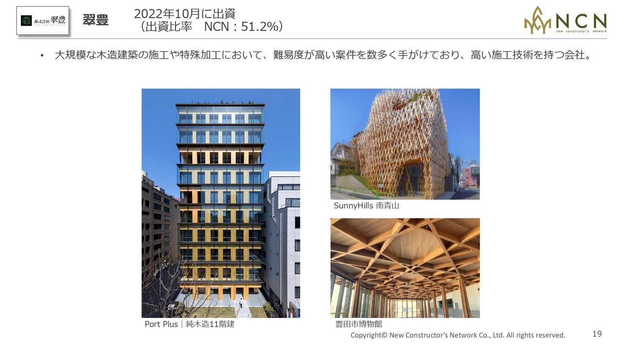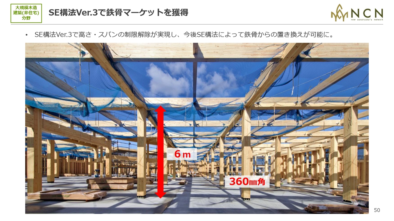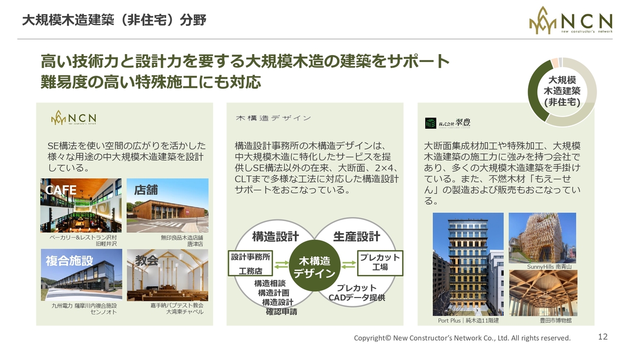 「SE構法」だけではなかなか進まないため、「SE構法」以外にも「在来工法」や「ツーバイフォー工法」といった木造の仕組みを構造設計する会社である木構造デザイン、さらに高層木造やドーム状の複雑な木造建築を施工する会社である翠豊の3社が連携し、大規模木造建築(非住宅)分野を形成しています。
