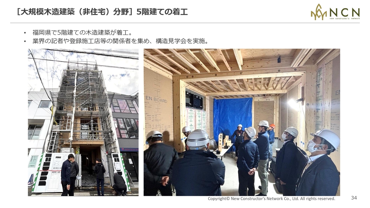 田鎖:第3四半期において、大規模木造建築(非住宅)分野では、5階建ての木造建築が着工しました。「SE構法」での5階建て建築は珍しいため、多くの方が集まり、見学会が開催されました。