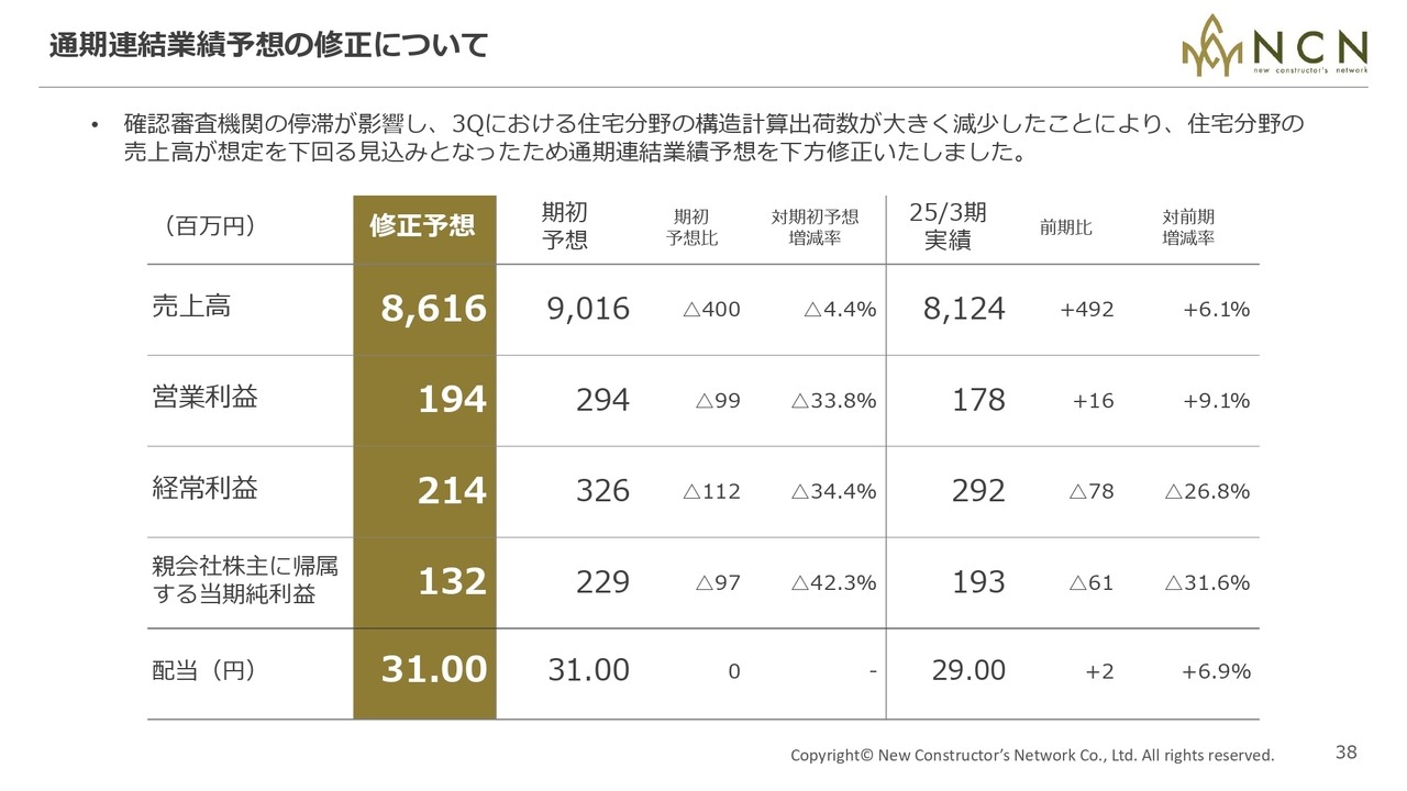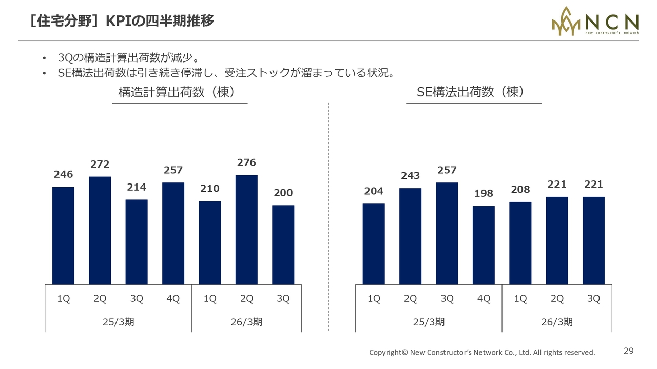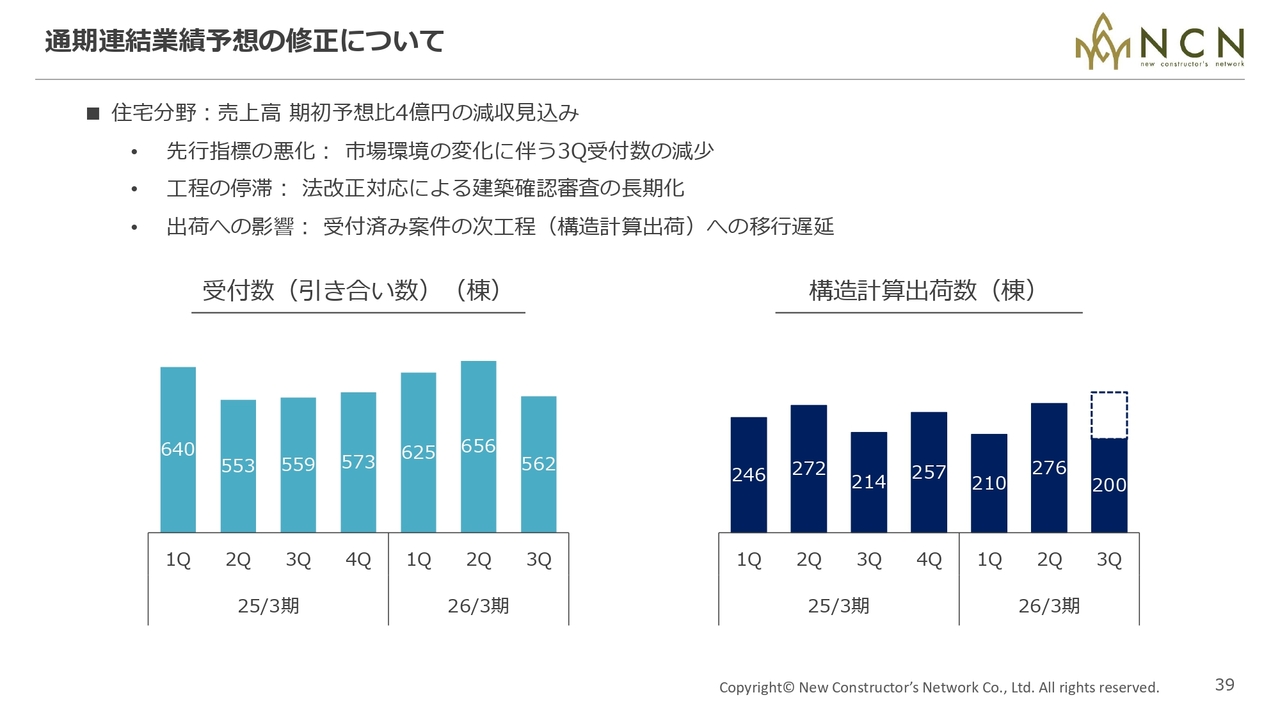 構造計算出荷数に関しては、第2四半期までは非常に順調にV字回復を見せていたのですが、第3四半期に大きく落ち込みました。これが予算修正を行う要因となりました。
