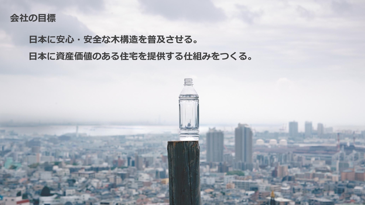 田鎖:会社の概要です。当社は「日本に安心・安全な木構造を普及させる。」「日本に資産価値のある住宅を提供する仕組みをつくる。」の2つの目標を掲げて設立した会社です。