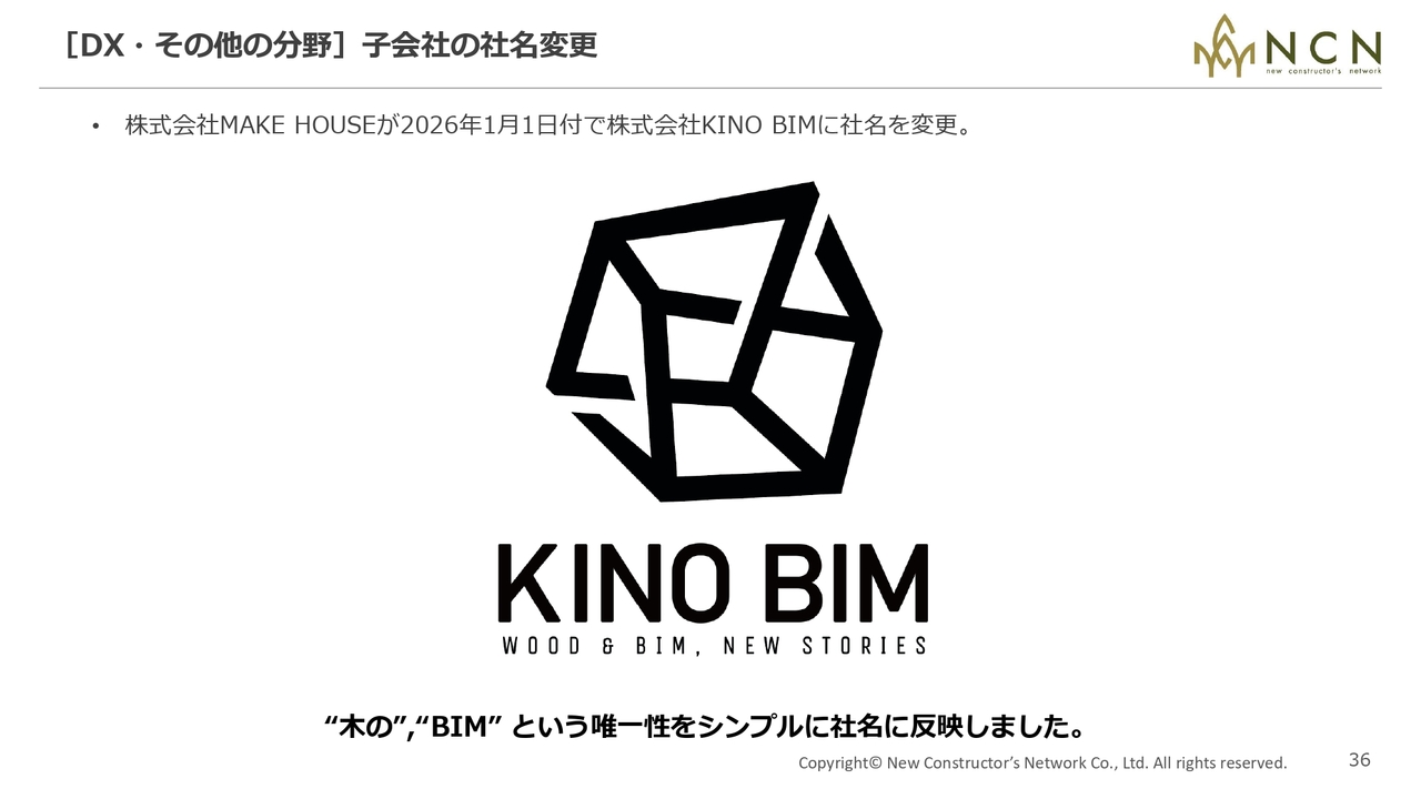 田鎖:グループ会社についてご説明します。まず、テクノロジー分野は、木構造デザイン、翠豊、KINO BIMで構成されています。KINO BIMは名前のとおりBIMを作る会社で、「木のBIM」を手がけています。