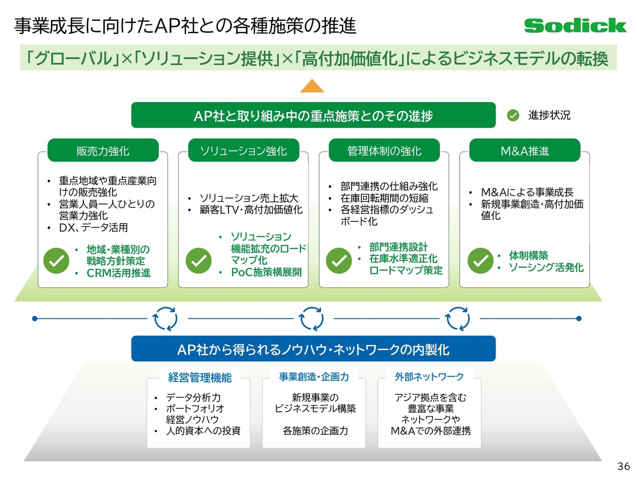 AP社との連携に関する取り組みについてです。「グローバル」「ソリューション提供」「高付加価値化」を軸に、事業成長に向けた各種施策を整備し、推進しています。