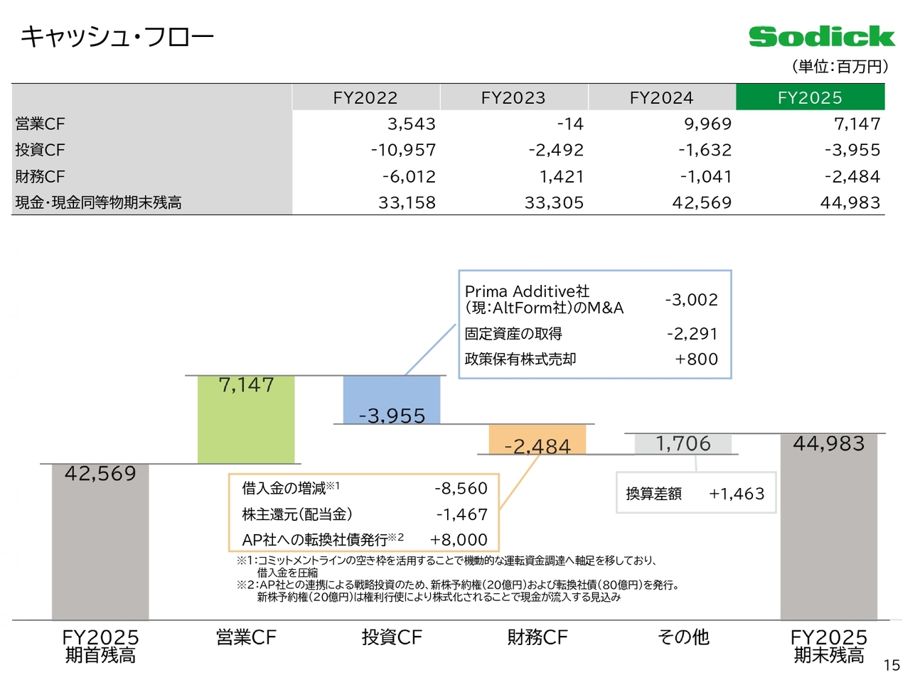 キャッシュ・フローについてです。営業キャッシュ・フローはプラス71億円となりました。投資キャッシュ・フローは、AltForm社のM&Aや設備投資によりマイナス39億円となりました。