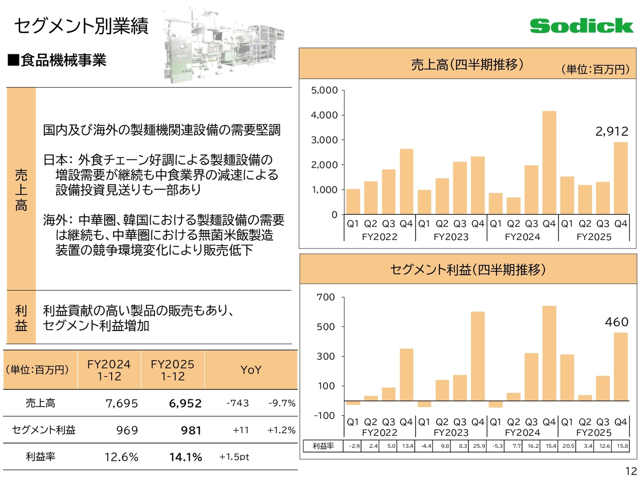 食品機械事業についてです。国内外で製麺機関連の設備需要が非常に堅調に推移しました。一方で、中華圏では無菌包装米飯装置の競争環境が変化しており、売上高は減収となりました。また、比較的収益性の高い製品の販売もあり、セグメント利益は増益となっています。