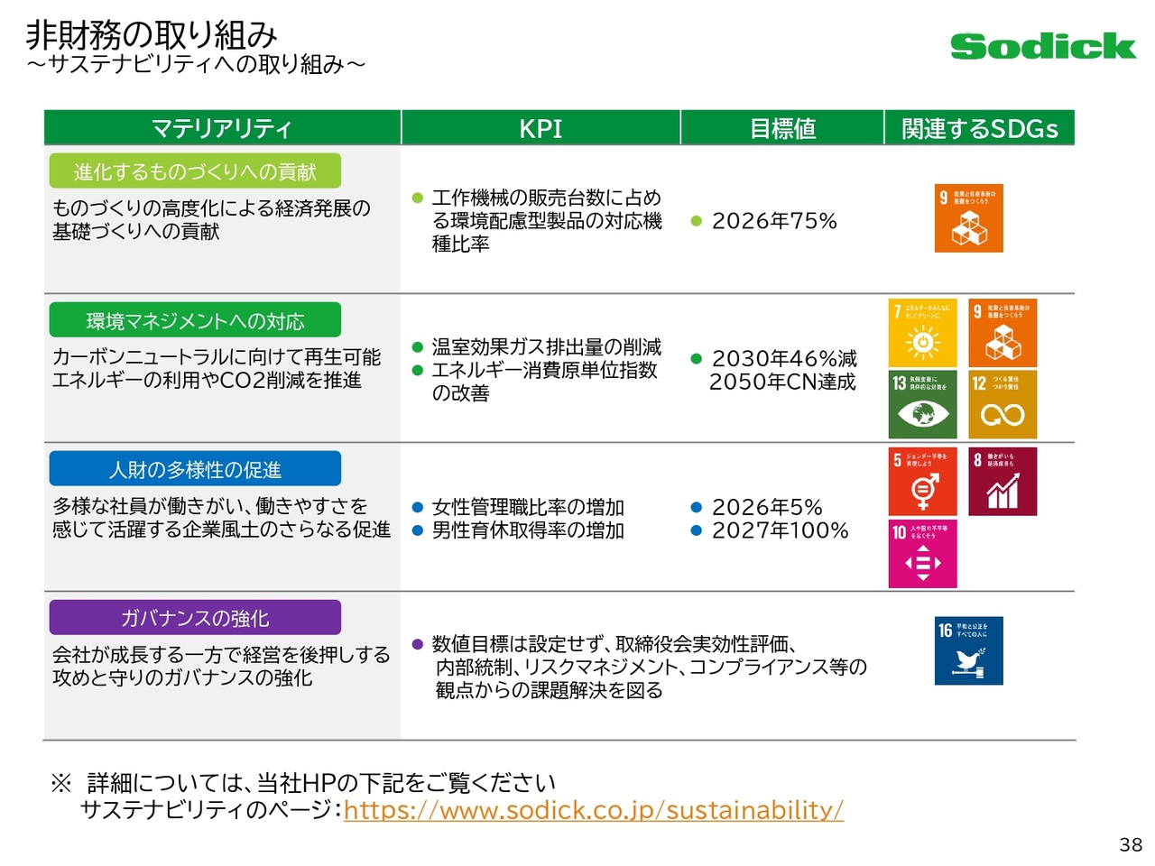 サステナビリティへの取り組みについてお伝えします。当社は、4つの重要なマテリアリティを特定し、それに基づいてKPIを設定し、取り組みを進めています。詳細は当社ホームページのサステナビリティページや統合レポートに記載していますので、お時間のある時にご覧ください。