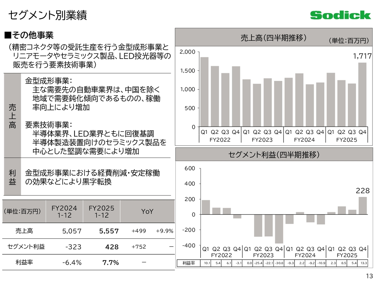 その他事業についてです。金型成形事業では、自動車関係の需要が鈍化傾向にありましたが、半導体製造装置向けセラミックス製品を中心に堅調な需要が見られたため、売上高は増収となりました。