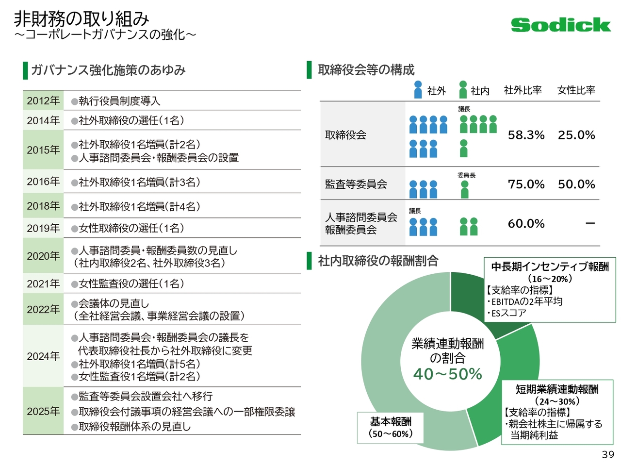 コーポレートガバナンスの強化についてです。スライド左側にある表のとおり、各種施策を実施しています。2025年から監査等委員会設置会社へ移行し、経営監督機能の強化を進めています。