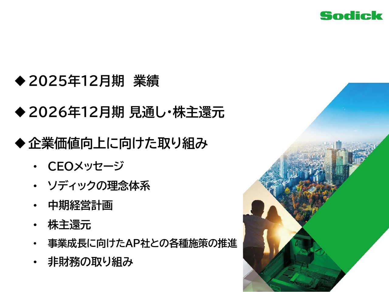 2025年12月期の業績や2026年12月期の見通し、株主還元については常務の高木から、企業価値向上に向けた取り組みについては社長執行役員の圷からご説明します。