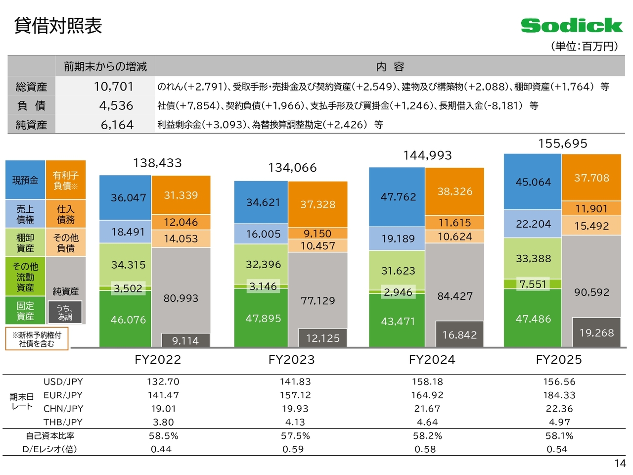 純資産については、利益剰余金やユーロ・人民元の期末レートが円安に振れた影響で為替換算調整勘定が増加し、前期末比で約61億円増加しました。