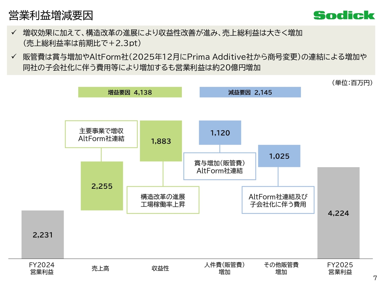 また、2025年にイタリアの金属3Dプリンターを手掛けるPrima Additive社を子会社化し、現在はAltForm社に商号変更されています。この会社が下期から当社の連結対象となり、下期の売上増加に貢献しました。
