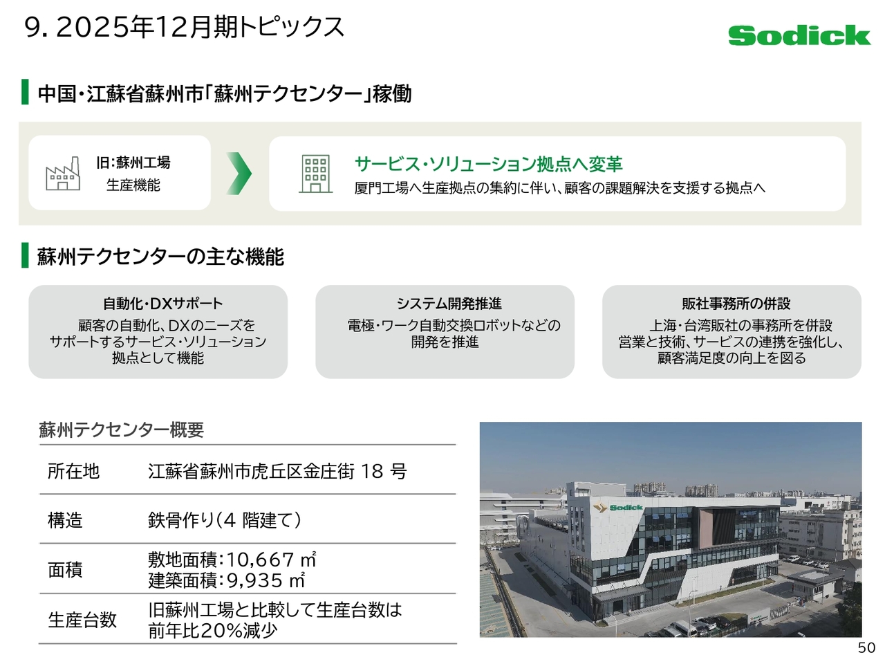 圷:当社は構造改革を2023年後半から開始し、各種経費削減を進めてきました。また、工場の生産最適化にも取り組んでおり、昨年12月には蘇州テクセンターの移転が完了しました。スライドに掲載されているとおり、竣工式も実施しています。