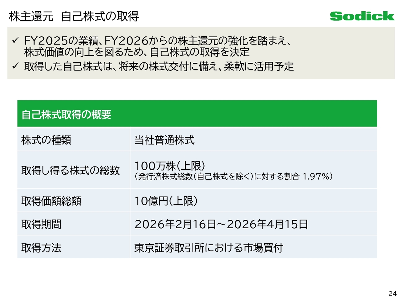 2025年12月期の総還元性向方針40パーセントの未達を踏まえ、さっそく自己株式取得を実施しました。取得総数の上限は100万株、取得金額の総額は上限10億円としています。また、取得した自己株式については、将来の株式交付に備えて柔軟に活用する予定です。