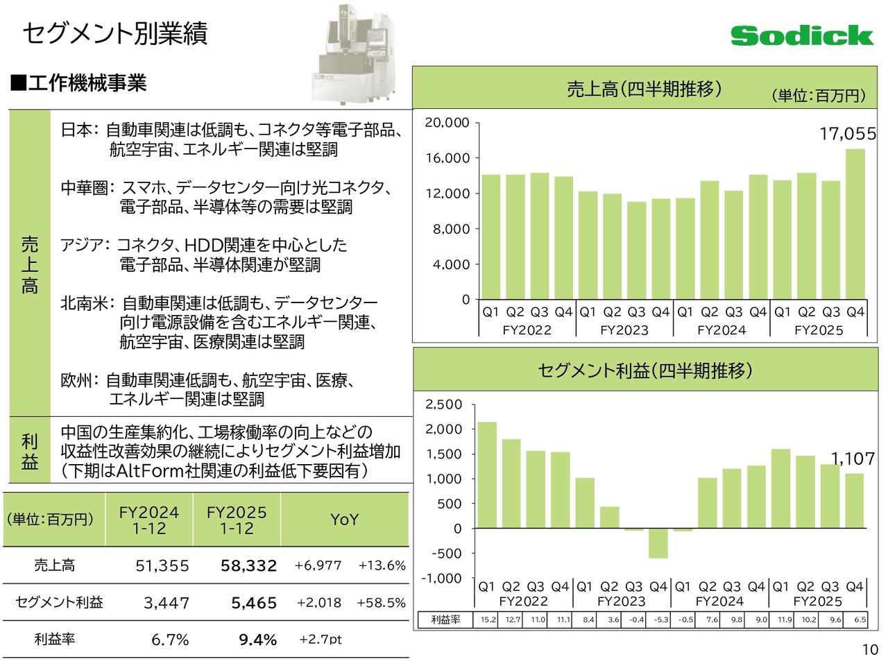 工作機械事業についてです。中華圏におけるスマートフォン、データセンター向け光コネクタ、電子部品、半導体関連の需要が堅調に推移しました。欧米では航空宇宙や医療関連が堅調に推移しています。これらの結果、売上高は前期比13.6パーセントの増収となりました。