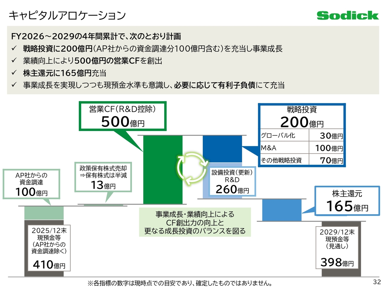 これらの投資に加え、既存設備の更新や研究開発投資を継続的に行うことで、事業成長と業績向上を実現し、4年間で累計500億円の営業キャッシュ・フロー創出を見込んでいます。また、本計画期間中には、政策保有株式の売却による資金流入も想定しており、成長投資と財務健全性の両立を図ります。