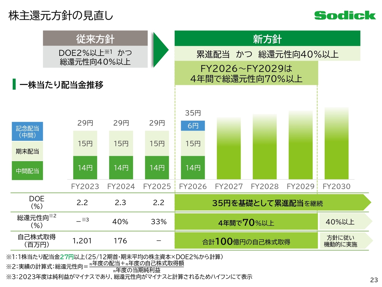 2025年12月期はこの方針に従い、中間配当14円、期末配当15円の年間配当29円を予定しています。ただし、昨年末に為替変動の影響があり、総還元性向の水準は40パーセントに達しませんでした。