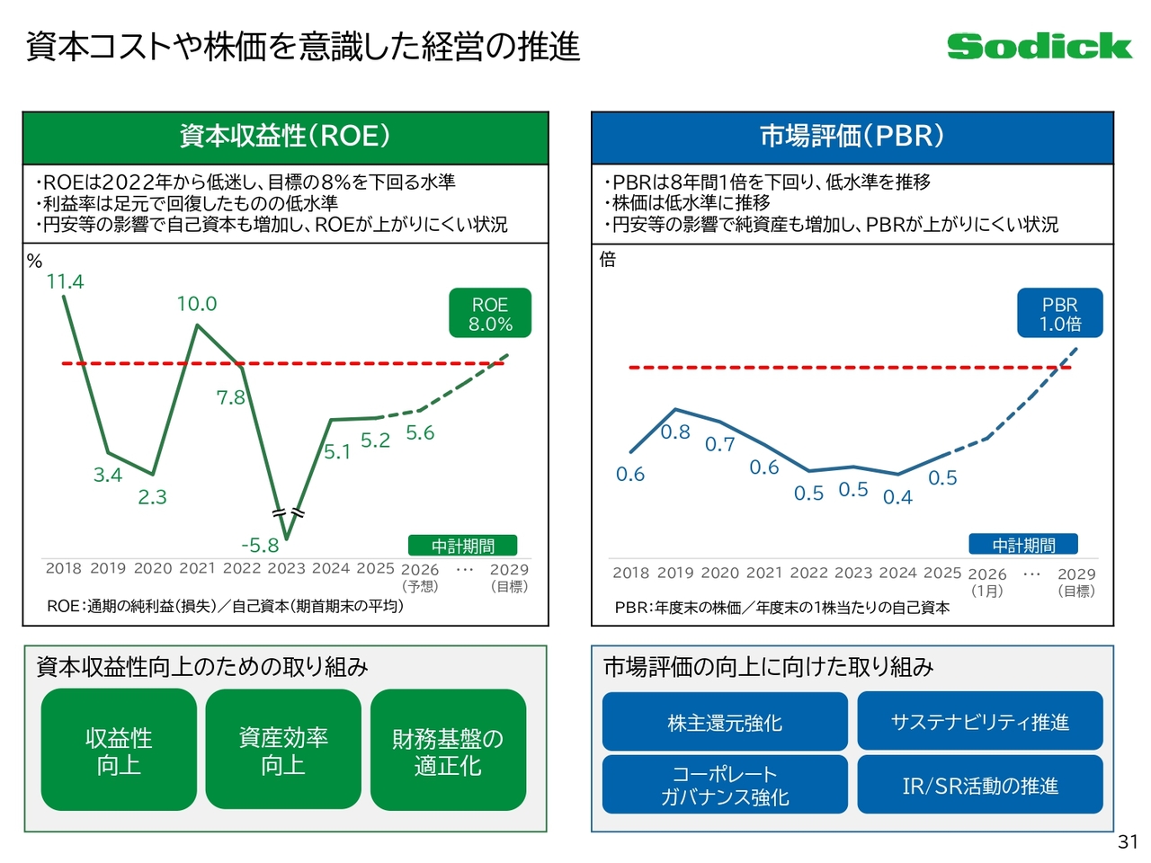 4つ目の企業価値向上に向けた目標についてです。売上高や営業利益だけでは不十分であるため、ROE、PBR、EPSについても明確な目標を設定しました。これは2029年時点だけの目標ではなく、できる限り早期に到達させることが私たち経営陣の意思です。