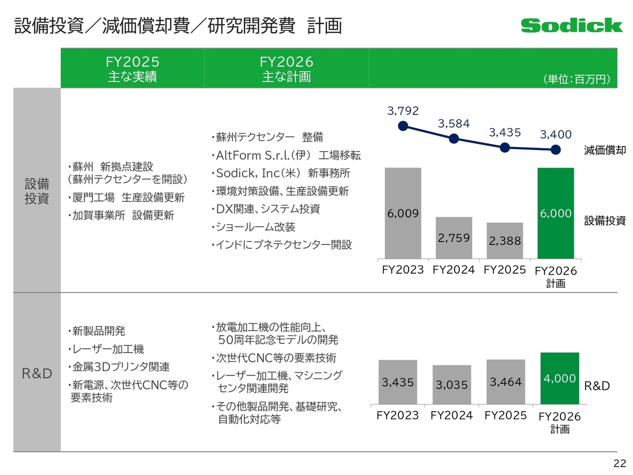 設備投資と研究開発費についてご説明します。2026年12月期の設備投資は約60億円を見込んでおり、具体的には蘇州テクセンターの整備、アメリカおよびインドでの事務所の設立や移転、ショールームの改装などを計画しています。