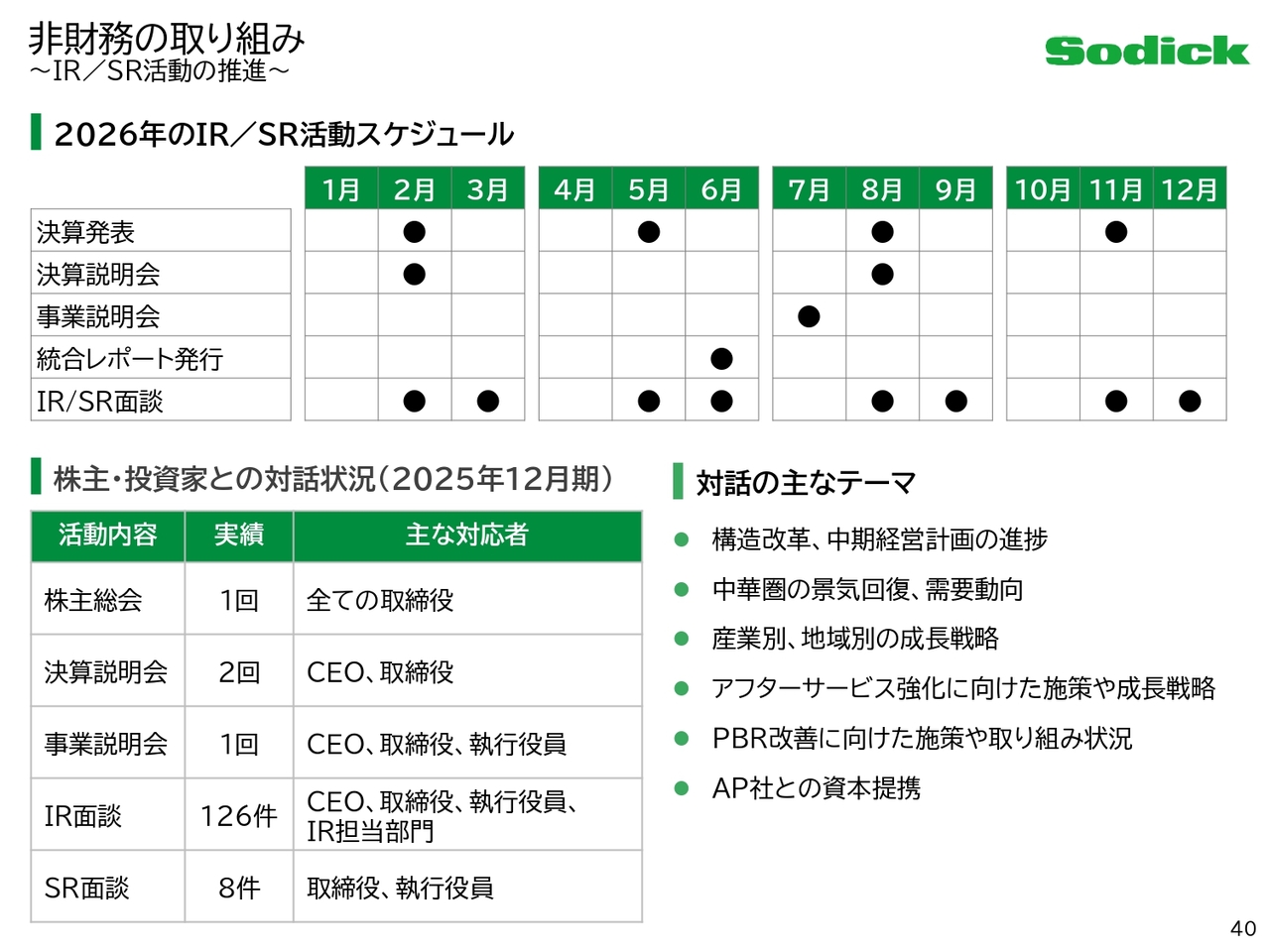 IR/SR活動の推進についてです。構造改革や中期経営計画の進捗、PBR改善に向けた取り組みを主なテーマに対話を実施しています。その中で、AP社との提携を含めた成長施策については、前向きな評価もいただいています。