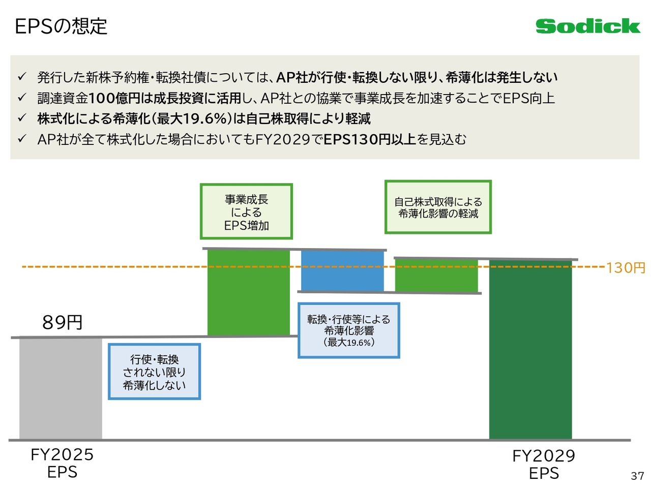 一方で、仮に行使・転換が行われた場合、最大で19.6パーセントの希薄化が想定されますが、自己株式取得などにより、その影響を一定程度は吸収可能と考えています。これらの前提を踏まえ、AP社がすべて株式化した場合でも、2029年12月期にEPS130円以上を見込んでいます。