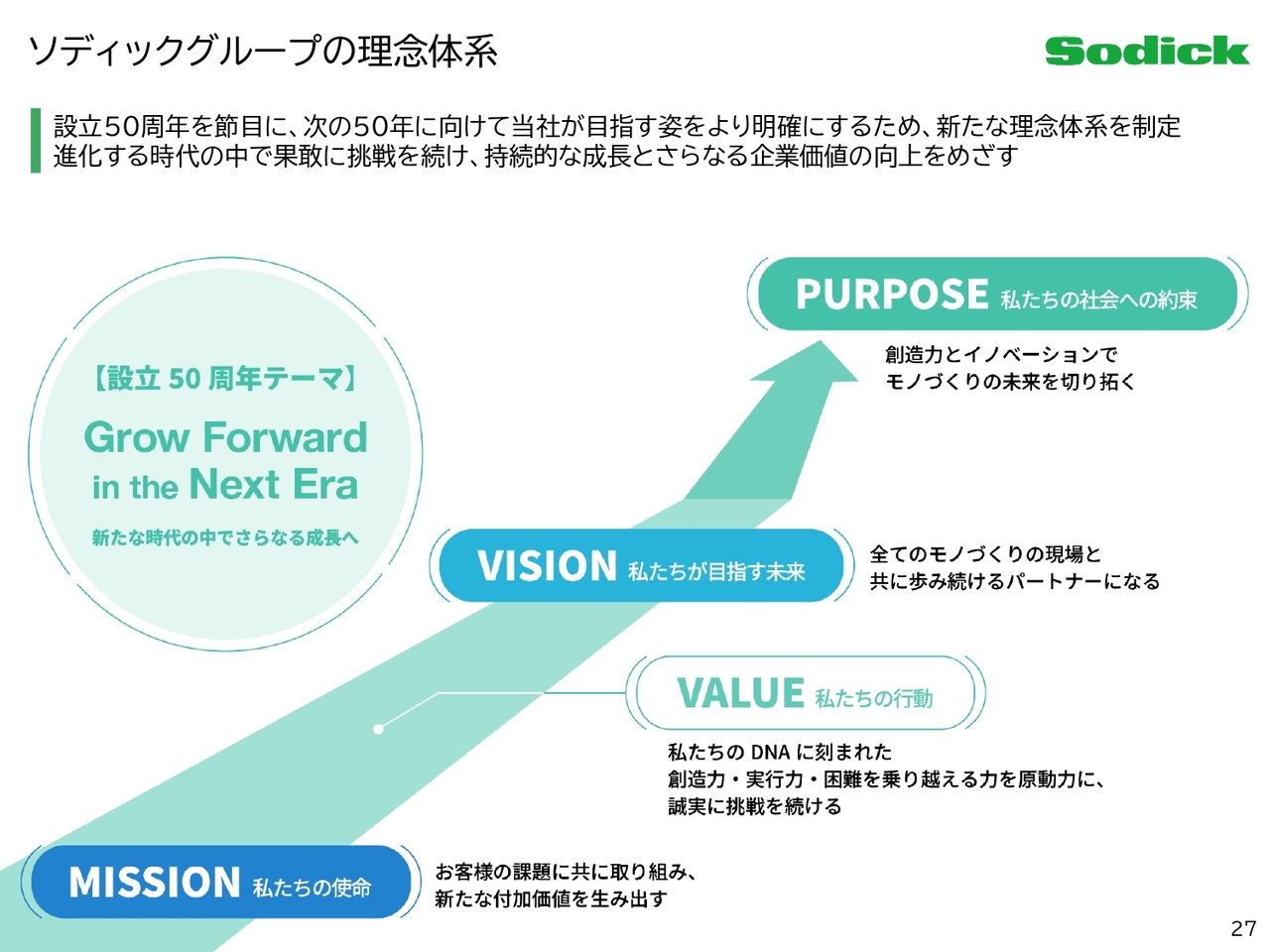 ソディックグループの理念体系についてです。当社は今年8月に設立50周年を迎えます。この節目にあたり、先ほど古川からお伝えしたように、次の50年に向けて当社が目指す姿をより明確にするため、パーパス、ミッション、ビジョン、バリューを制定しました。