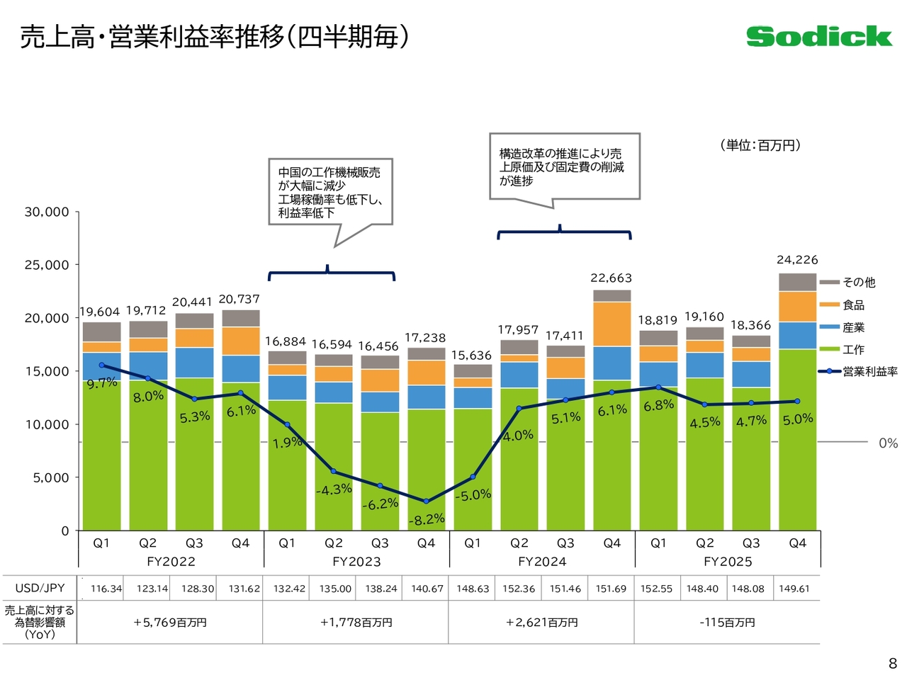 四半期ごとの売上高と営業利益率の推移です。第4四半期の売上高は約242億円となりました。第3四半期と比較して、主に工作機械と食品機械が大きく伸びました。利益面では増収効果もあり、第3四半期と比較して、利益額・利益率ともに増加しています。