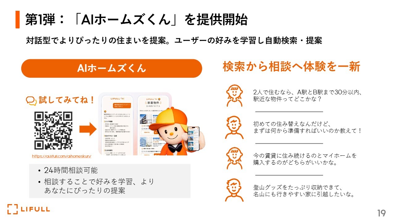 福澤:「AIホームズくん」については、動画を後ほどご覧いただくか、実際にお使いいただければと思います。24時間相談可能で、生成AIを活用しています。そのため、ご相談いただくことで、生成AIがユーザー一人ひとりの好みを学習し、さらにブラッシュアップされていきます。