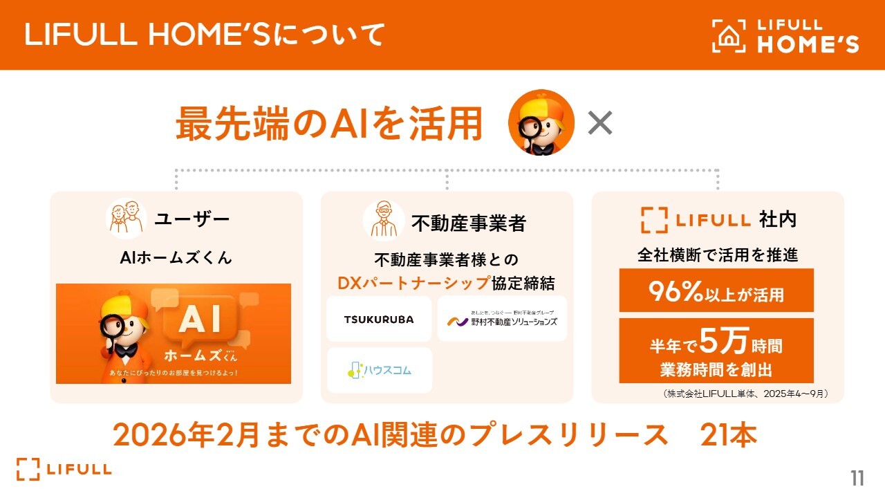 福澤:当社は最先端のAIを活用し、「LIFULL HOME'S」のサービスに取り組んでいます。スライドに示されているとおり、ユーザーのみなさまや不動産事業者のみならず、LIFULL社内でもAIを徹底的に活用し、各種取り組みを進めています。