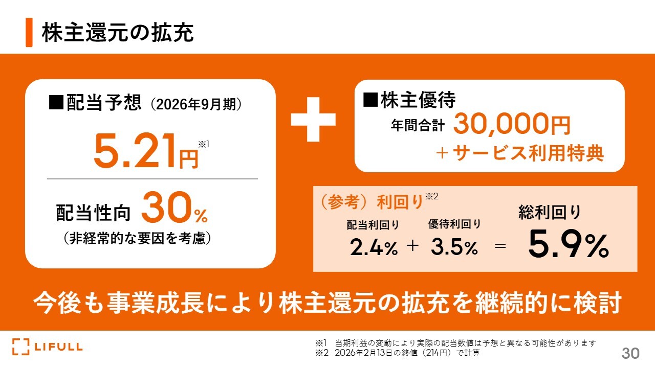 業績については、こちらに記載のとおりです。利益をしっかりと稼いだ上で、みなさまに還元するという点について、1つ目は配当による還元です。2月12日には、2026年9月期の配当予想を5.21円と発表しました。