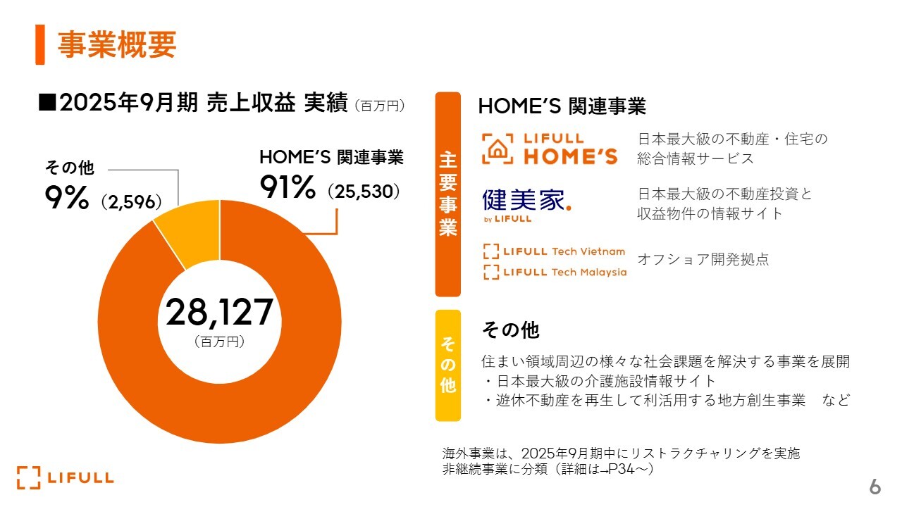 福澤:事業の概要です。前期の売上収益は281億円で、そのうち91パーセントがHOME'S関連事業によるものです。このHOME'S関連事業には、スライド右上にある日本最大級の不動産情報データベースを誇る「LIFULL HOME'S」や、日本最大級の不動産投資物件サイトである「健美家(けんびや)」などが含まれています。